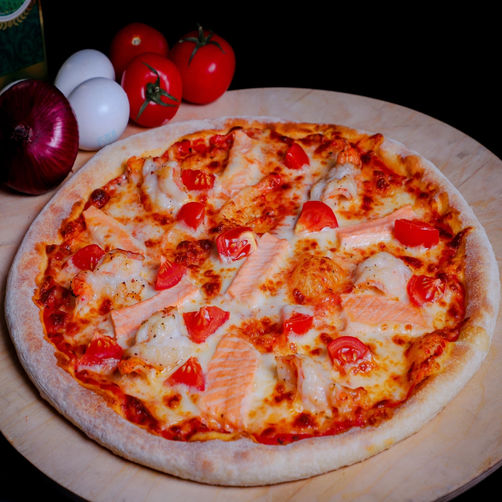 30 sm. Tomat sousu, mozzarella, sezar sousu, rukola, limon sousu, hisə verilmiş salmon, bufolo mozzarella